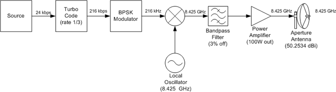 Figure 1 shows the block diagram of the communications transmitter for the relay satellite. The source of data will be coming from the solid state hard drives that act as a buffer between the incoming data from the probes and the outgoing data to the Earth.